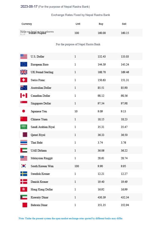 थप जानकारीको लागि नेपाल राष्ट्र बैंकको आजको विदेशी मुद्राको विनिमय दर यस प्रकार छ:-