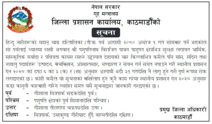 हिन्दु नारीहरूको महान चाड तीजको अवसरमा जिल्ला प्रशासन कार्यालय काठमाडौंले पशुपति मन्दिर वरपर मासु र मदिरा निषेध गरेको छ । एक सूचना प्रकाशित गरी जिल्ला प्रशासन कार्यालय काठमाडौंले यस्तो आदेश जारी गरेको हो ।