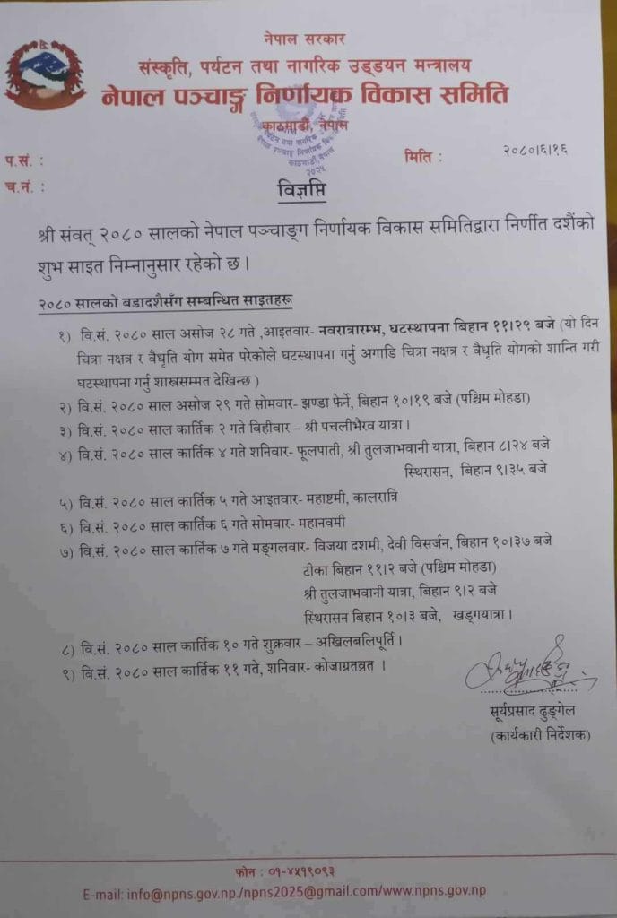 नेपाल पञ्चाङ्ग निर्णायकद्धारा दसैँको टीकाको साइत सार्वजनिक