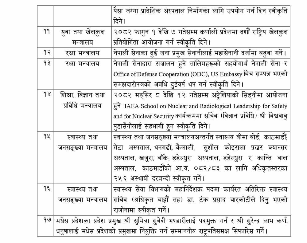 मन्त्रिपरिषद्को बैठकले नेपाल प्रहरीको महानिरीक्षकमा दानबहादुर कार्कीलाई नियुक्त गर्ने निर्णय गरेको छ भने बैठकले मधेश प्रदेशकी प्रदेश प्रमुख सुमित्रा सुवेदी भण्डारीलाई पदमुक्त गर्ने निर्णय गरेको छ । त्यस्तै बैठकले फागुन १ देखि ७ गतेसम्म कर्णाली प्रदेशमा दशौँ राष्ट्रिय खेलकुद प्रतियोगिता आयोजना गर्न स्वीकृत दिने निर्णय लगायत कुल १७ निर्णय गरेको छ ।