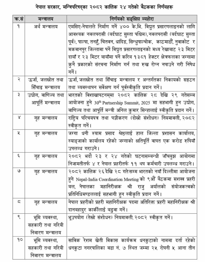 काठमाडौँ । कार्तिक २४ गते बसेको मन्त्रिपरिषद्को बैठकका निर्णयहरु सार्बजनिक गरिएको छ ।