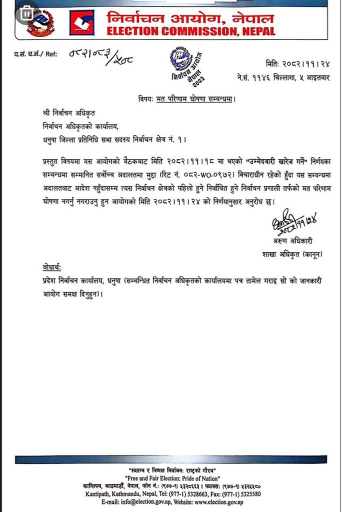 धनुषा- १ को मत परिणाम घोषणा नगर्न निर्वाचन आयोगको निर्देशन