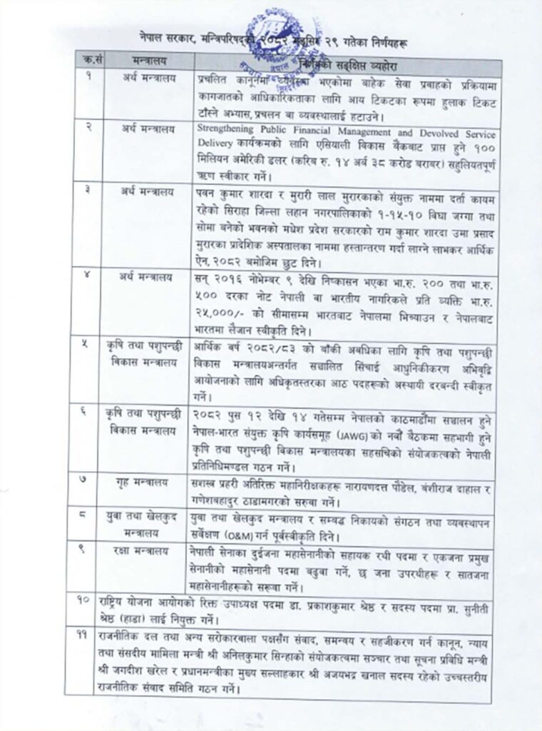 काठमाडौं । मङ्सिर २९ गते बसेको मन्त्रिपरिषद्को बैठकका निर्णयहरु सार्बजनिक गरिएको छ । सञ्चार तथा सूचना प्रविधिमन्त्री तथा सरकारका प्रवक्ता जगदीश खरेलले मन्त्रिपरिषद्को बैठकका ११ निर्णय निर्णयहरु सार्बजनिक गरेका हुन् ।